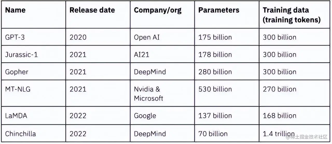 2019年之前,大多数LLM的参数都在数亿级。2019年,OpenAI发布了有15亿参数的 GPT-2。2020年,谷歌和微软发布了T5和Turing NLG,分别包含110亿和170亿个参数。2020年年中,OpenAI发布了1750亿个参数的GPT-3。从那时起,大型模型开始接连出现,例如AI21的Jurassic-1(1780亿个参数)、DeepMind的Gopher(2800亿个参数)、Nvidia和微软的MT-NLG(5300亿个参数)以及北京智源研究院的WuDao 2.0(1.75万亿个参数)。