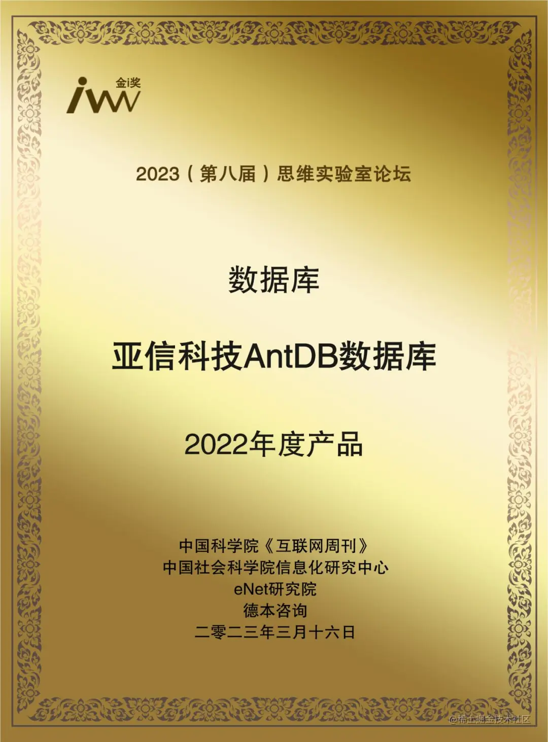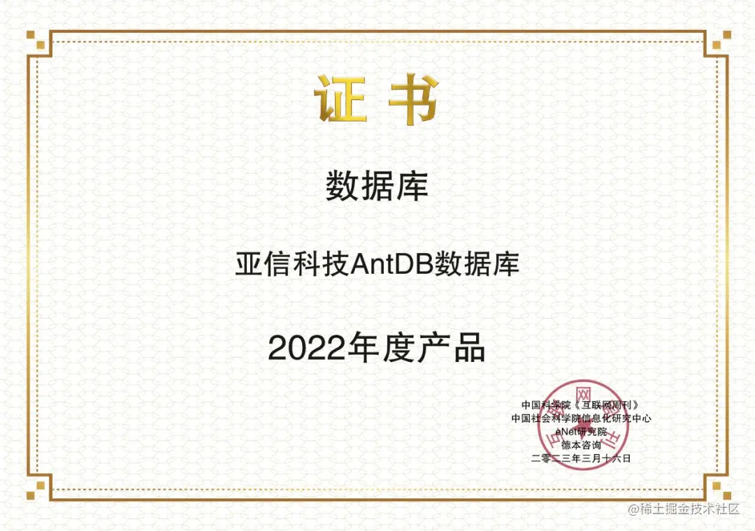 图1 AntDB数据库荣获互联网周刊金i奖“2022年度产品”