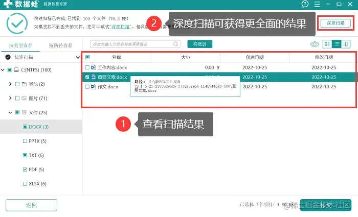3.在界面右侧查看扫描结果,若文件结果过少,点击【深度扫描】 可获得更全面的扫描结果;