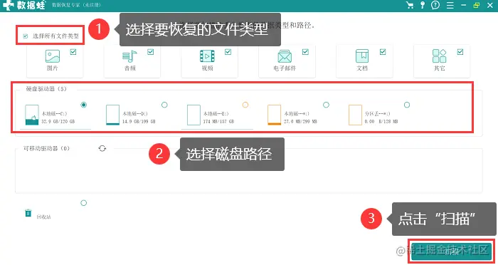 - 选择要恢复的文件类型(如果没有明确的文件类型恢复,全选可以得到更全面的扫描结果),和要扫描的磁盘路径后点击【扫描】;