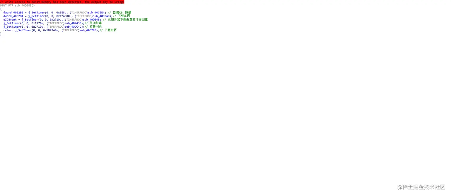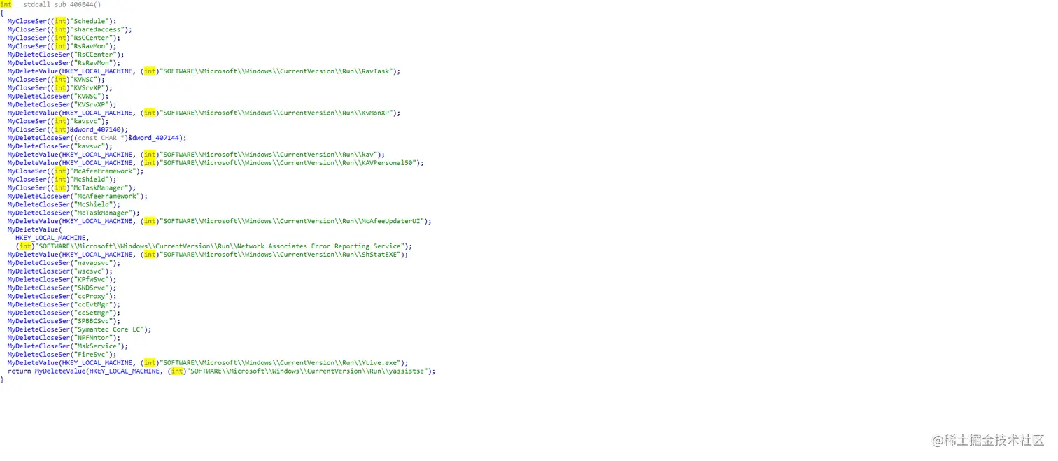 根据分析我对里面的函数都进行了重命名,都是删除注册表值,关闭服务等内容,这里是关闭了杀软。
