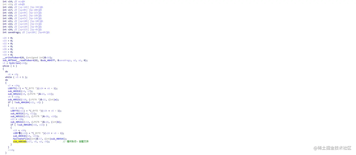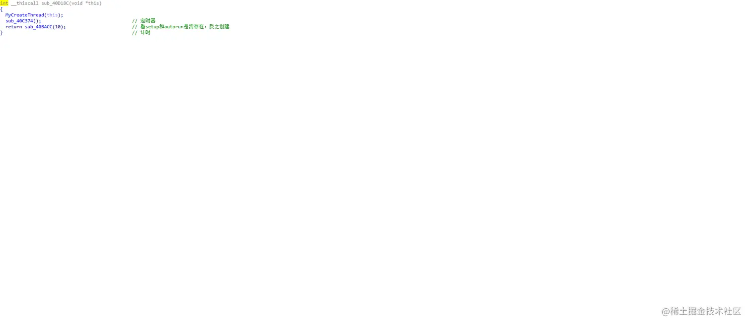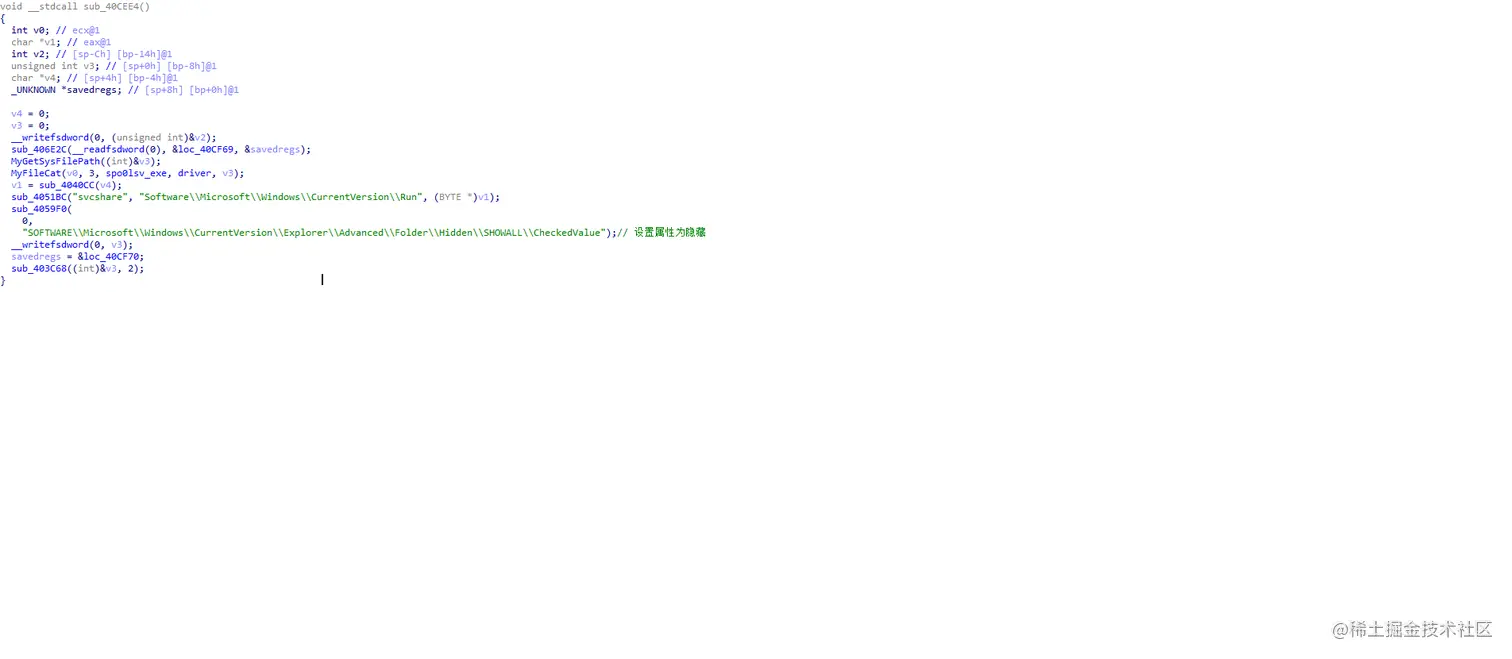 里面有些函数是我根据分析+猜测修改的名称,以My开头,根据注册表路径信息可以看到,这里是进行了自启动注册表修改,然后设置属性为隐藏。