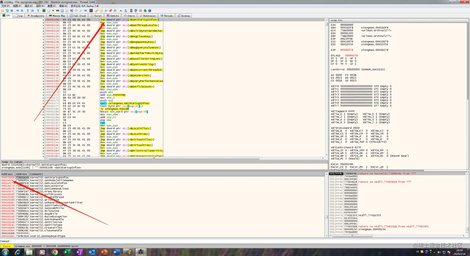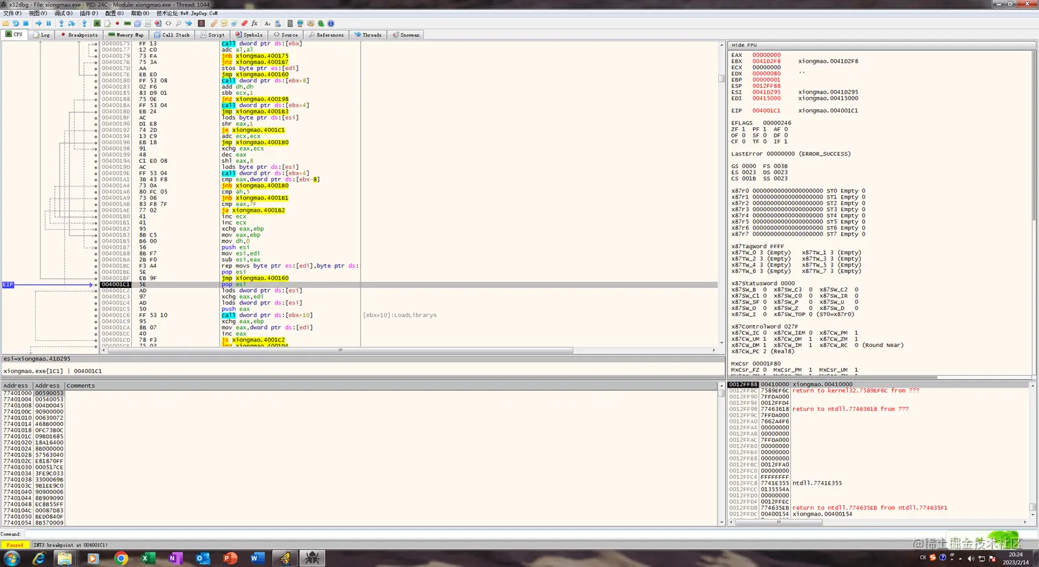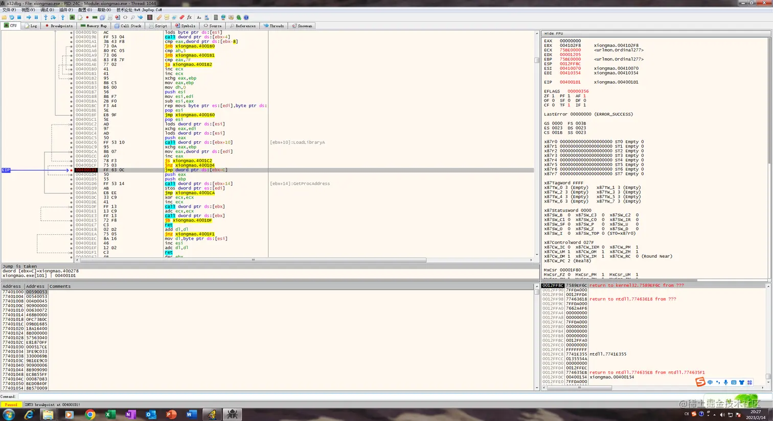 然后继续F8就会发现又是一个循环,俩个函数一个LoadLibrary,一个GetProAddress,这里应该是修复IAT表,然后我们F4到其中跳出循环的jmp上面: