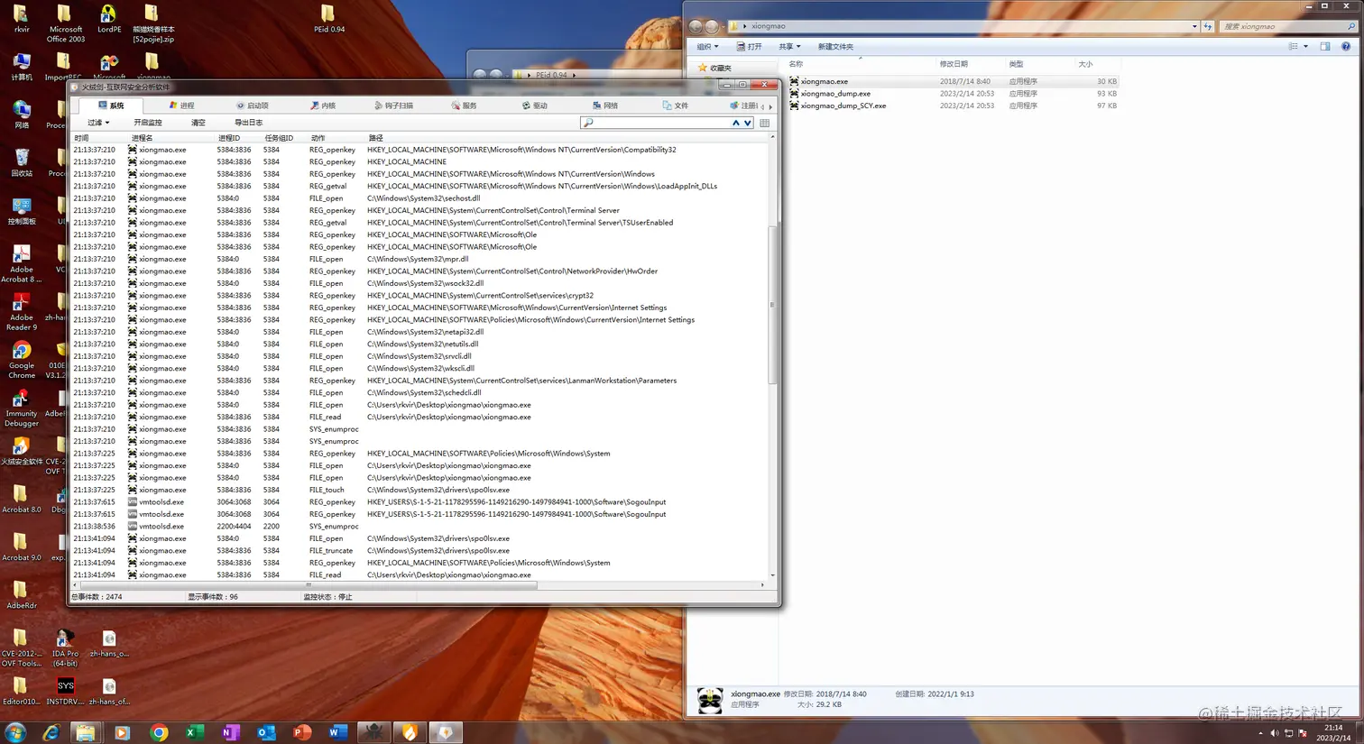 首先拍个快照,为了更好的查看熊猫行为,咱赋予他管理员权限,然后把熊猫添加到信任区,最后打开火绒剑开启监控,过滤掉其他进程: