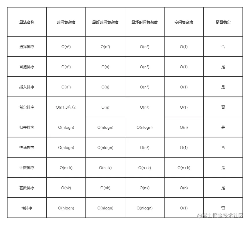 这张图介绍了各个排序的时间复杂度和空间复杂度,大家一定要牢固掌握。