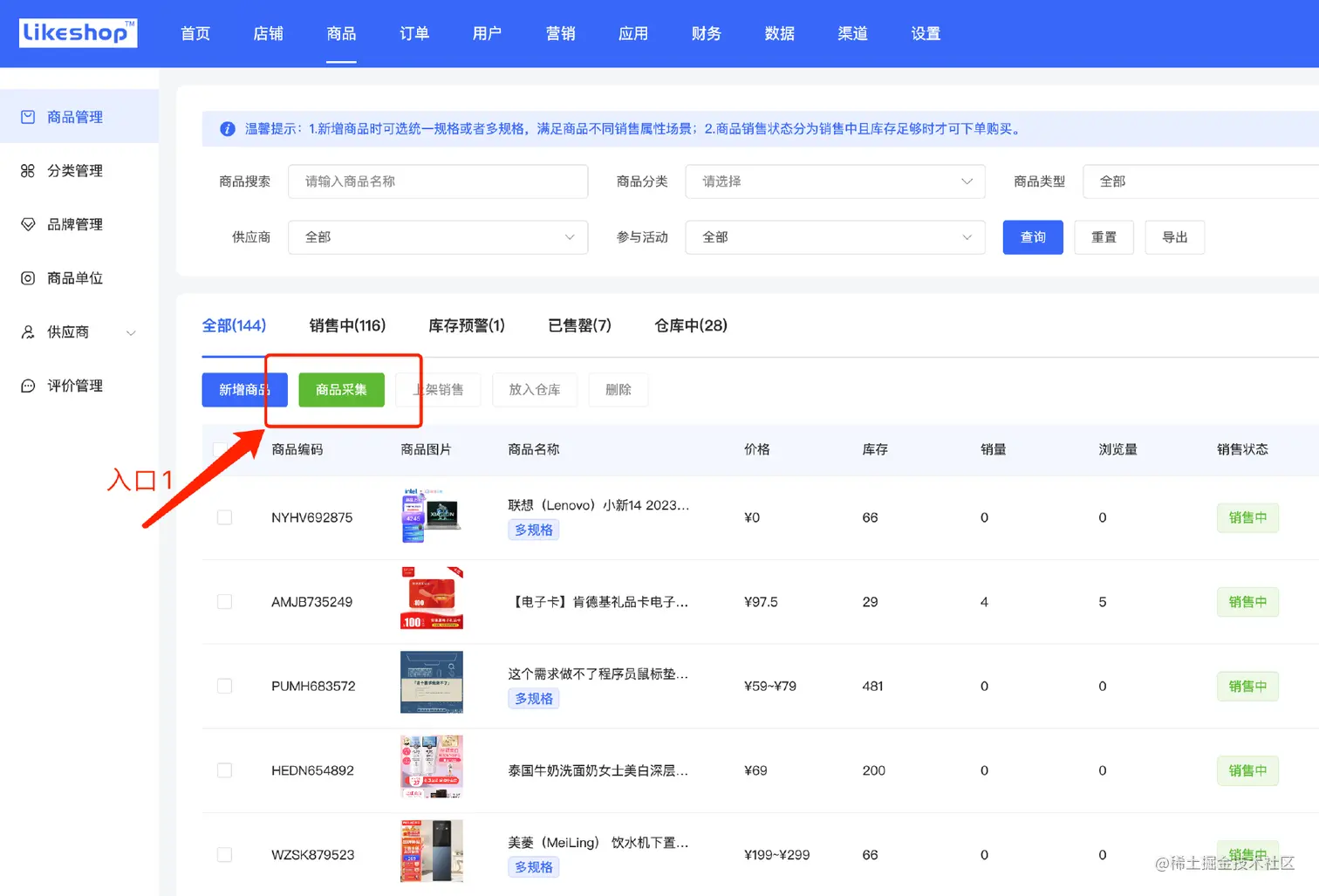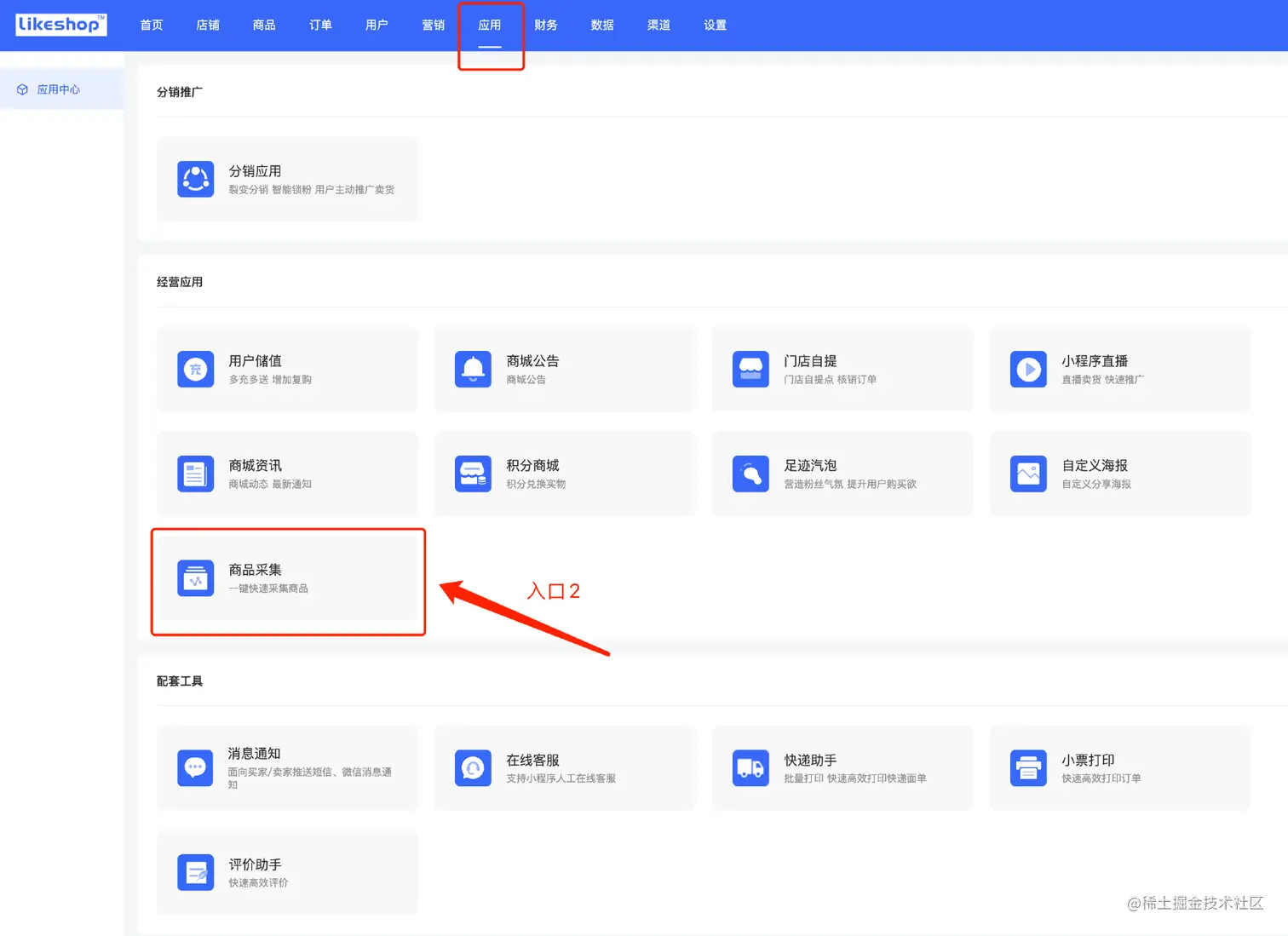 商品采集有2个采集入口,入口1在【商品】—【商品管理】中的【商品采集】;入口2在【应用】—【商品采集】