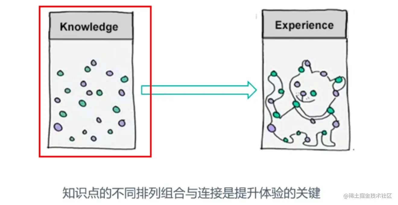 简言之,引用《通过智能内容提供出色的客户体验》课程中的提到的一张图片(如下图),我们可以直观的看出,知识点的不同排列组合与连接是提升体验的关键。那么,如何来排列和连接这些知识,就需要用到信息架构中的构建方式、类型及设计逻辑。