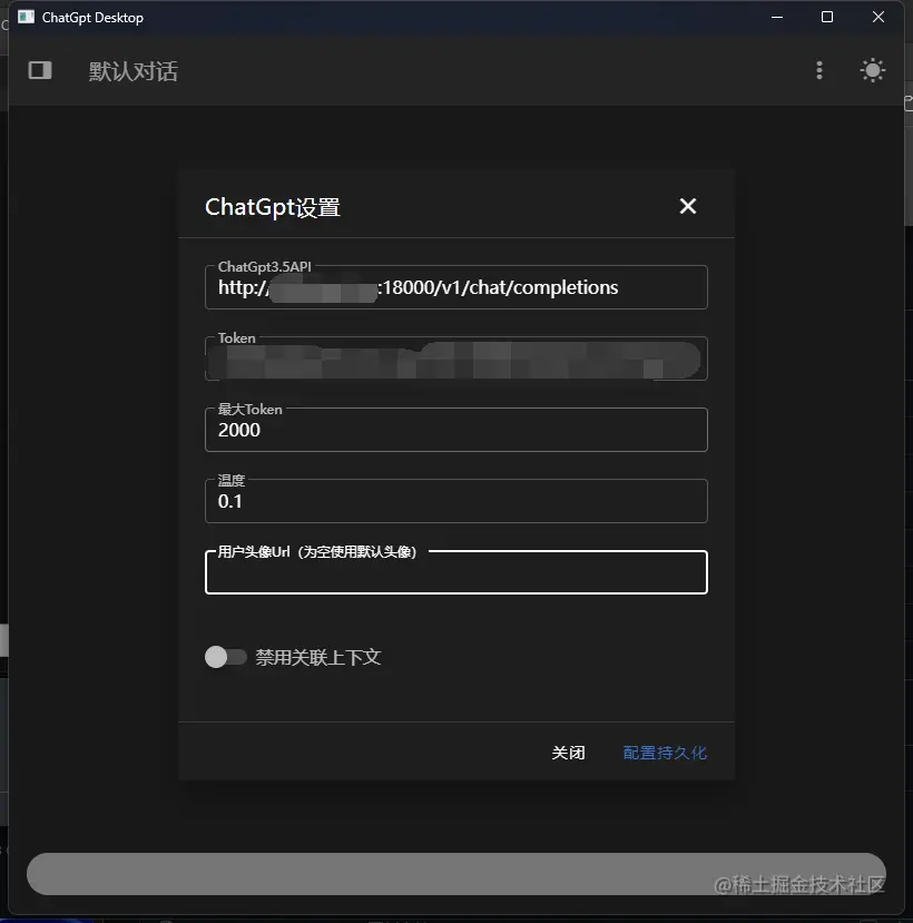 设置请求token和配置好的服务器地址 http://服务器地址:18000/v1/chat/completions,然后点击配置持久化