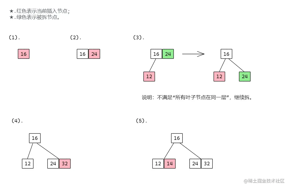 插入规则:当按照规则插入一个数到某个节点时,不能满足上面三个要求,就需要拆,先向上拆,如果上层满,则拆本层, 拆后仍然需要满足上面 3 个条件;