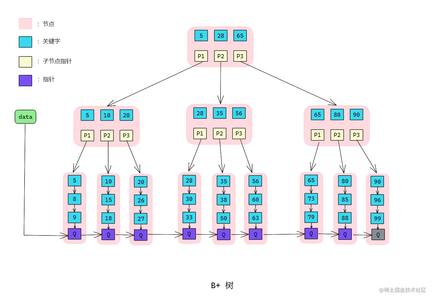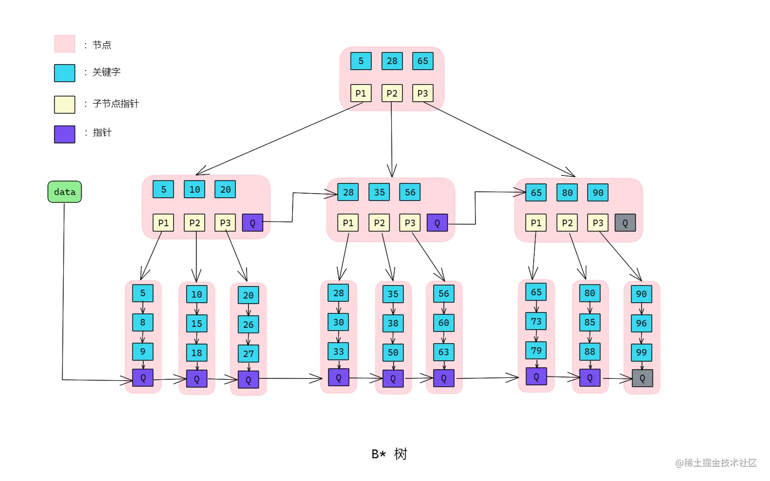 B*树是B+树的变体,在B+树的非根和非叶子节点再增加指向兄弟的指针。- 示意图: