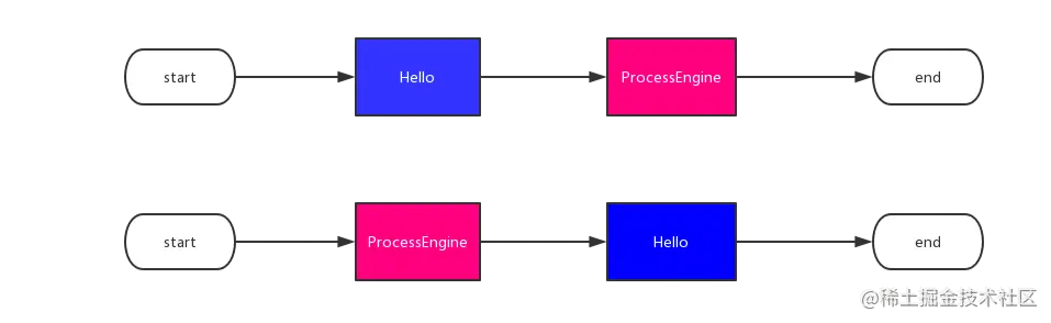 - 第一个流程,可以打印Hello ProcessEngine,第二个流程可以打印ProcessEngine Hello,这两个流程的区别是只有顺序不同,蓝色的节点与红色的节点的本身功能没有发生变化