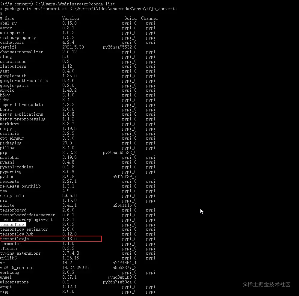 为了不影响前面目标检测训练环境,这里我用conda创建了一个新的Python虚拟环境,Python版本3.6.8。在安装转换器的时候,如果当前环境没有Tensorflow,默认会安装与TF相关的依赖,只需要进入指定虚拟环境,输入以下命令。