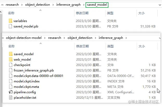 导出的模型在项目的inference_graph文件夹(models\research\object_detection)里,frozen_inference_graph.pb是 tf_frozen_model输入格式需要的,而saved_model文件夹就是tf_saved_model格式。在当前目录下新建web_model目录,用于存储转换后的web格式的模型。