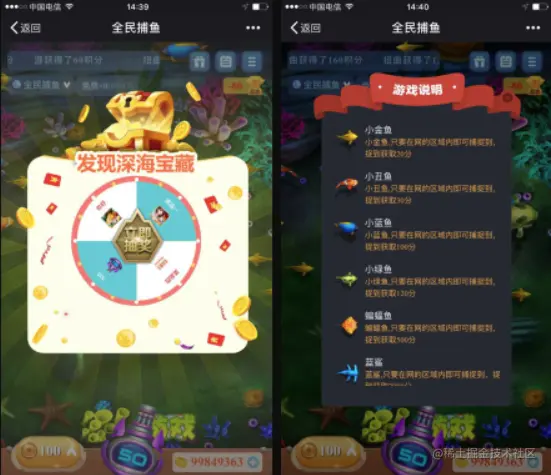 【营销】:首次参与免费赠送粉丝捕鱼机会,机会用完后每10分钟增加一次游戏机会,分享给好友可增加游戏机会,无机会时使用积分捕鱼。