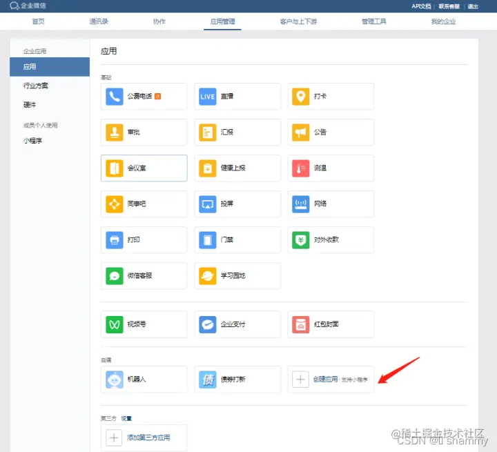 登录网页版企业微信 (work.weixin.qq.com),点击 应用管理 → 应用 → 创建应用