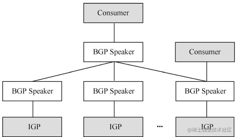 BGP-LS的典型应用场景和架构如图4-3所示,其中Consumer(消费者)相当于控制器。在每个IGP域中,只需其中一台路由设备运行BGP-LS,直接和Consumer建立BGP-LS邻居关系。采用这种集中式的BGP Speaker机制后,Consumer只需对外建立一个BGP-LS连接,就可以实现对全网拓扑信息的收集,从而简化了网络的运维和部署。