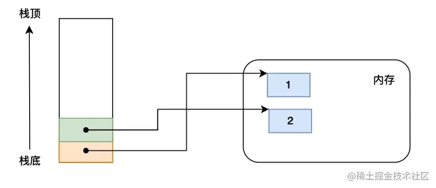 - LOAD_FAST,是取出 co_varnames 对应下标的数据,并且将其压入栈中。我们直接连续执行两个 LOAD_FAST 之后栈空间的布局如下: