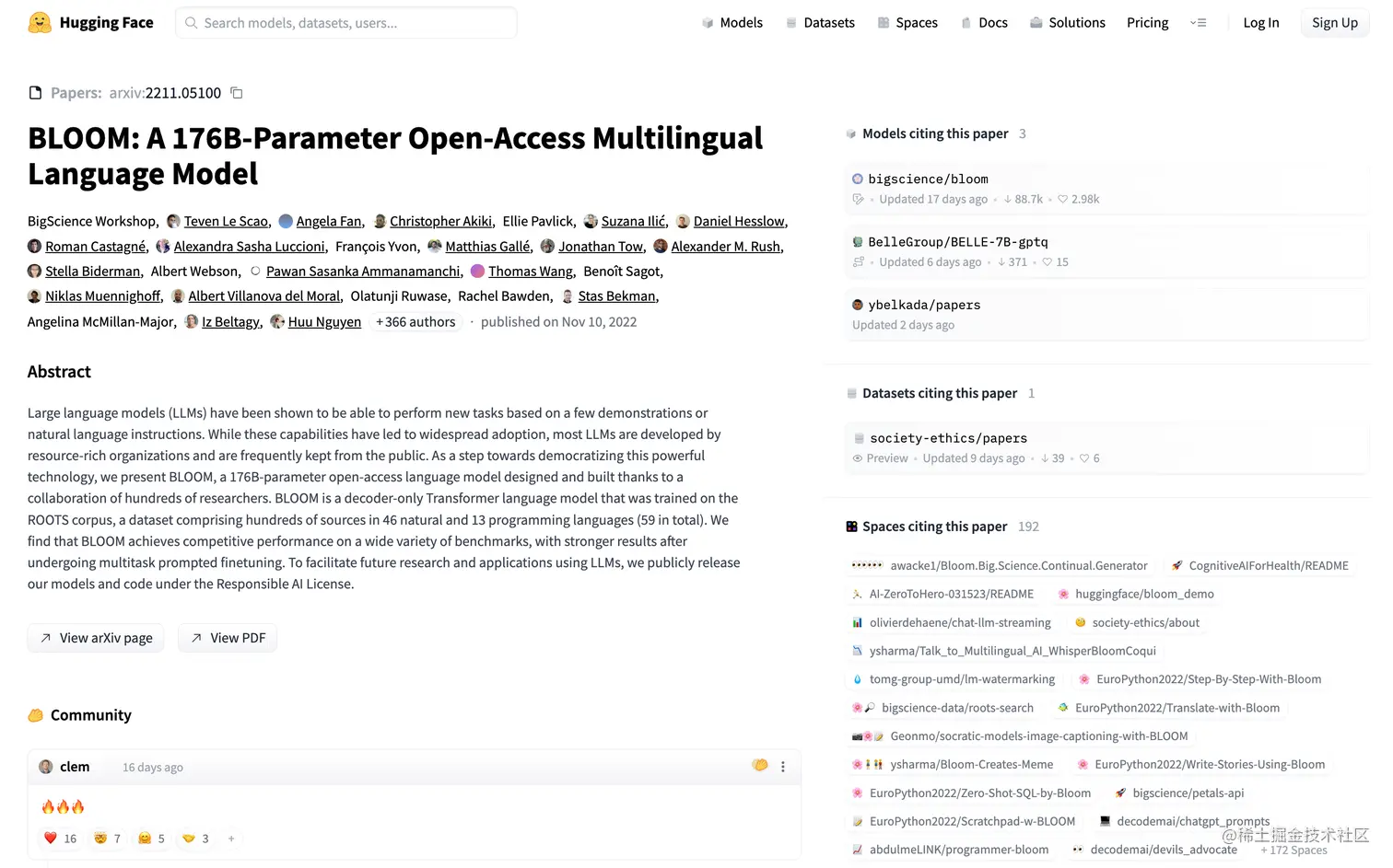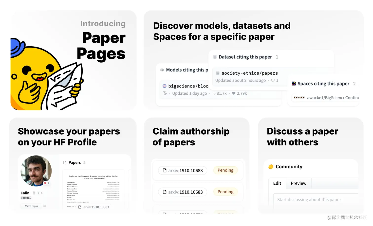 我们正在继续加深与预印本平台 (arXiv.org) 的合作和集成,除了可以在论文页面直接找到 Hugging Face 上的 Space 应用以外,我们又为 Hugging Face Hub 上线了一个论文页面,比如: hf.co/papers/2211…