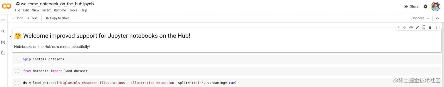 Hub 的页面现在可以直接渲染 .ipynb 文件 (Jupyter Notebook) 啦 ,除此之外,我们还与 Google Colab 团队合作,现在 Colab 可以直接打开托管在 Hugging Face Hub 上的 .ipynb 文件啦: