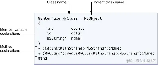 下图展现了声明一个叫做 MyClass 的类的语法,这个类继承自 NSObject 基础类。类声明总是由 @interface 编译选项开始,由 @end 编译选项结束。类名之后的(用冒号分隔的)是父类的名字。类的实例(或者成员)变量声明在被大括号包含的代码块中。实例变量块后面就是类声明的方法的列表。每个实例变量和方法声明都以分号结尾。