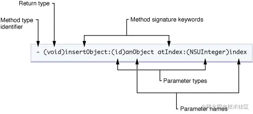 方法声明包括方法类型标识符,返回值类型,一个或多个方法标识关键字,参数类型和名信息。下图展示 insertObject:atIndex: 实例方法的声明。声明由一个减号(-)开始,这表明这是一个实例方法。方法实际的名字(insertObject:atIndex:)是所有方法标识关键的级联,包含了冒号。冒号表明了参数的出现。如果方法没有参数,你可以省略第一个(也是唯一的)方法标识关键字后面的冒号。本例中,这个方法有两个参数。
