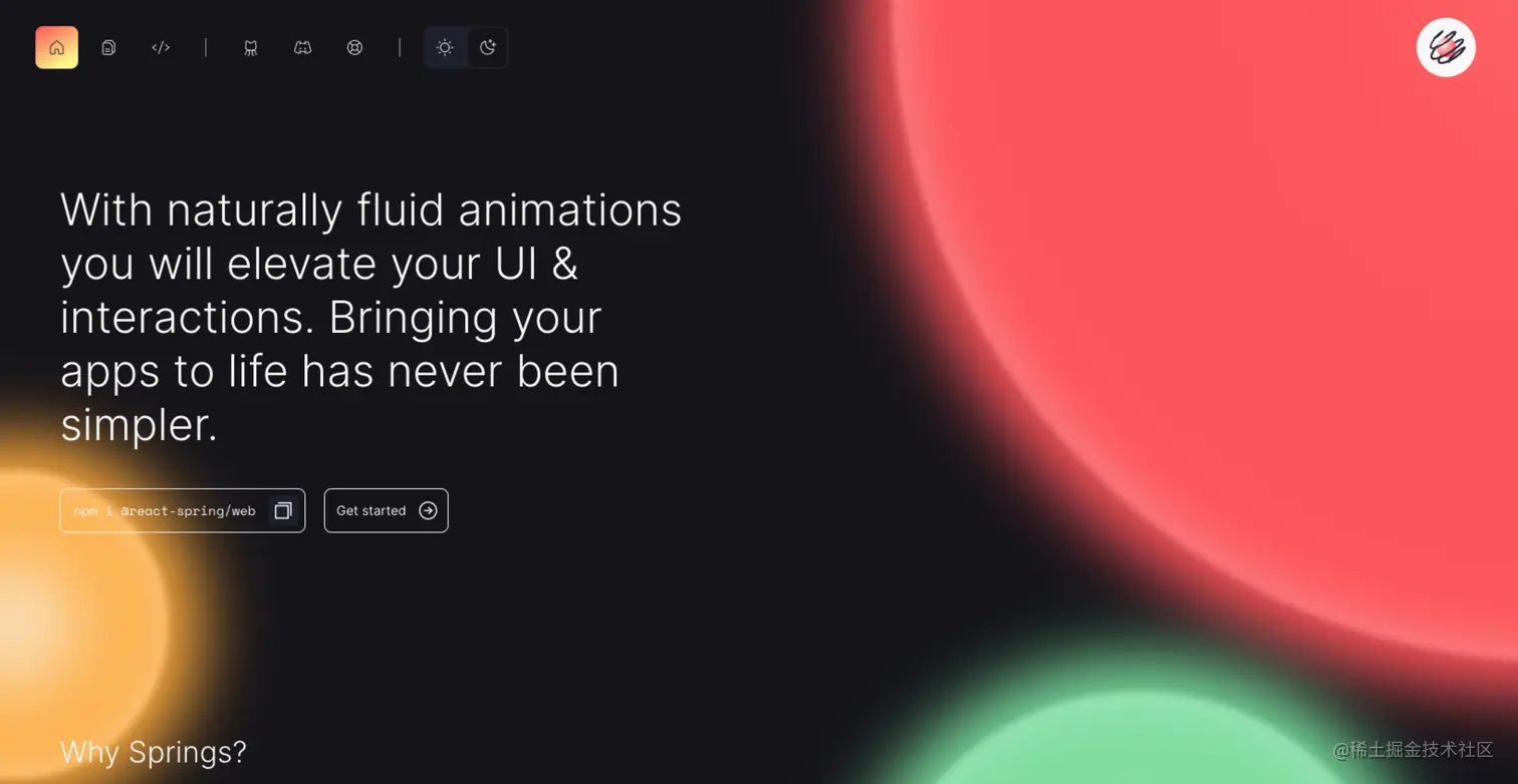 React-spring 是一个用于构建高性能、交互式 Web 应用程序的动画库。它使用了 Spring 动画库的物理模型,可以实现流畅的动画效果。React-spring 可以用于创建各种类型的动画,包括过渡、滚动、拖拽等。它提供了一些简单易用的 API,可以轻松地实现复杂的动画效果。React-spring 还支持多种平台,包括 Web、React Native 等。