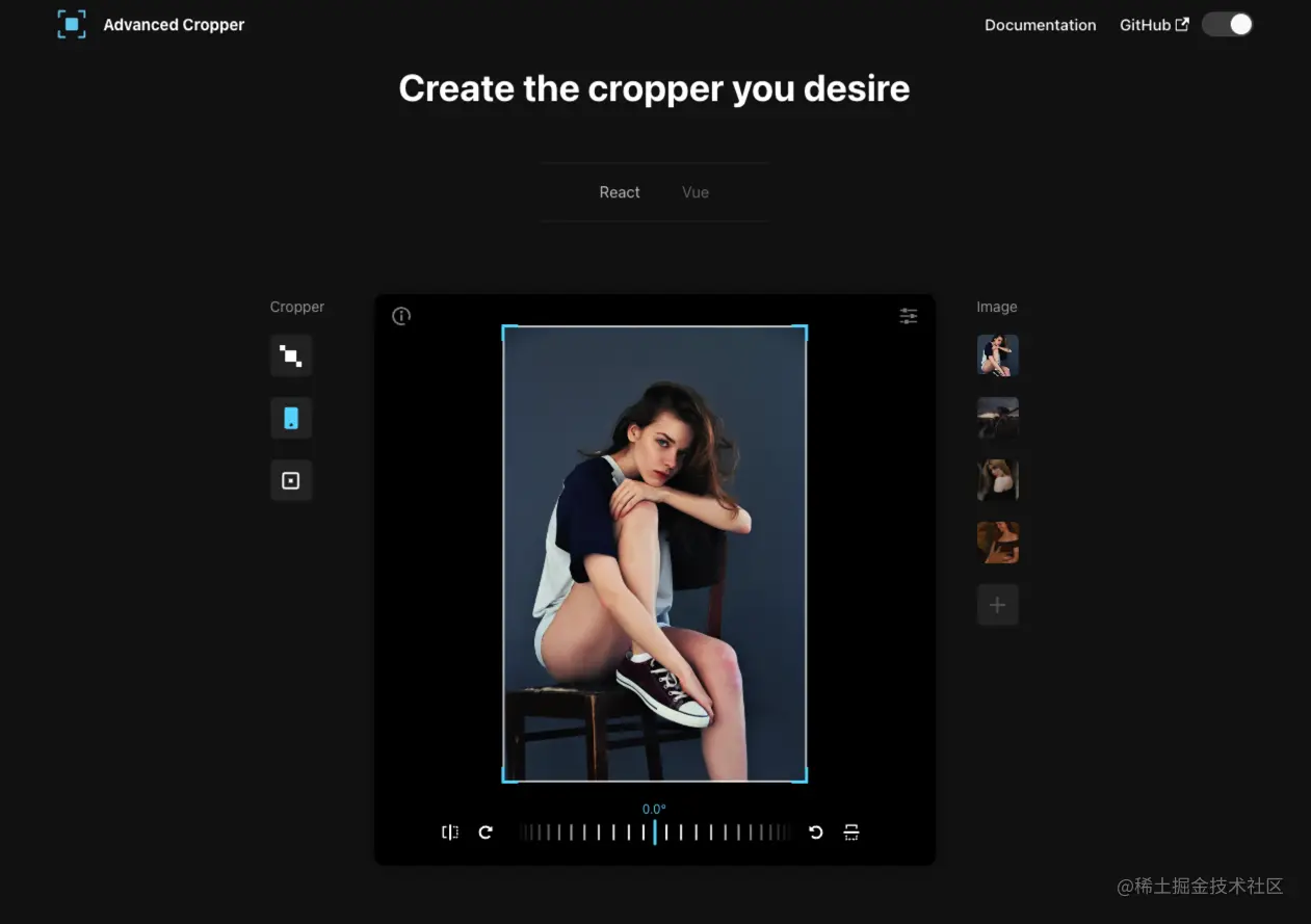 React-advanced-cropper 是一个用于构建 Web 应用程序的图片裁剪库。它提供了一些高级的裁剪功能,包括旋转、缩放、裁剪、翻转等。React-advanced-cropper 还支持多种裁剪模式,包括自由裁剪、固定比例裁剪、固定尺寸裁剪等。