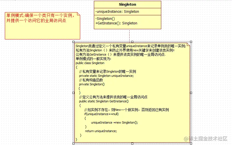 上述代码在 Singleton 的 静态属性 Instance 中, 只有在 instance 为 null 的时候才创建一个实例以避免重复创建。同时我们把构造函数定义为 私有函数, 这样就能确保只创建一个实例。