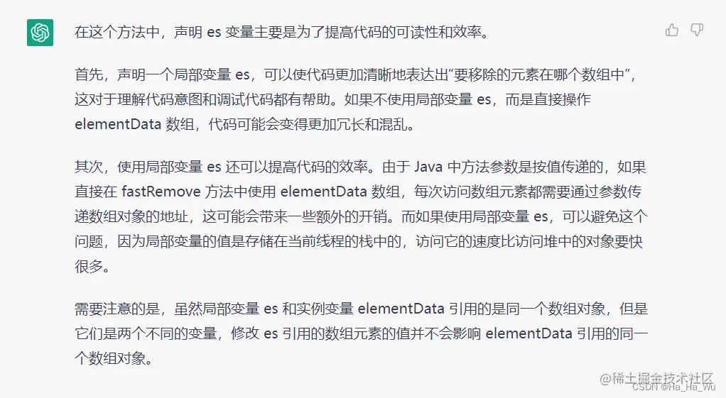 1:局部变量es的值存储在当前线程的栈中,而elementData作为类属性应该存的深一点,访问es开销更小。