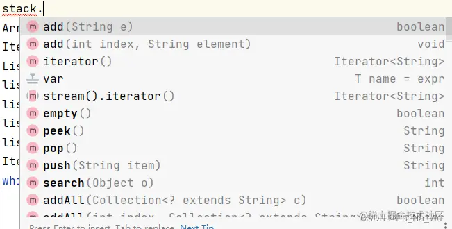 总体而言,集合类都会有iterator方法(或者重写过)用来产生一个迭代器,迭代器对象的三个基础方法有:next(),hasNext()和remove()。作用如下:
