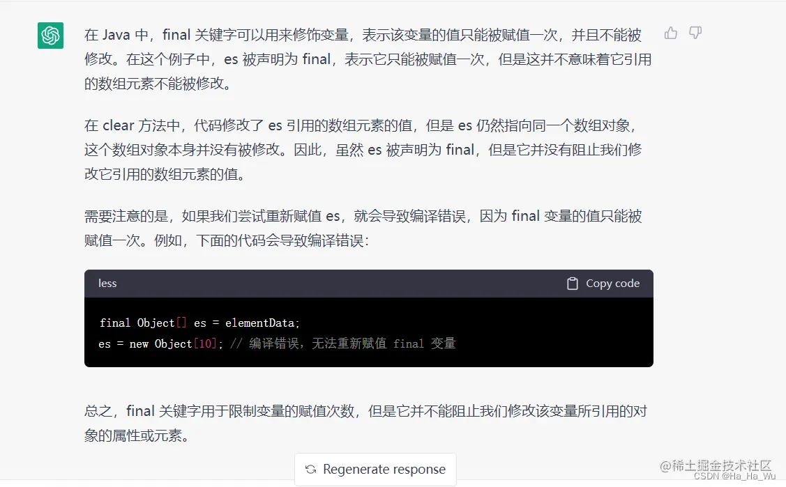 对于一般的基本数据类型,也许final声明后就真改不了了,但对于数组,对象等等引用数据类型,final只是绑定了声明的名称和引用对象,不能更改这个赋值关系,但是却可以微微小改这个引用对象里面的值。