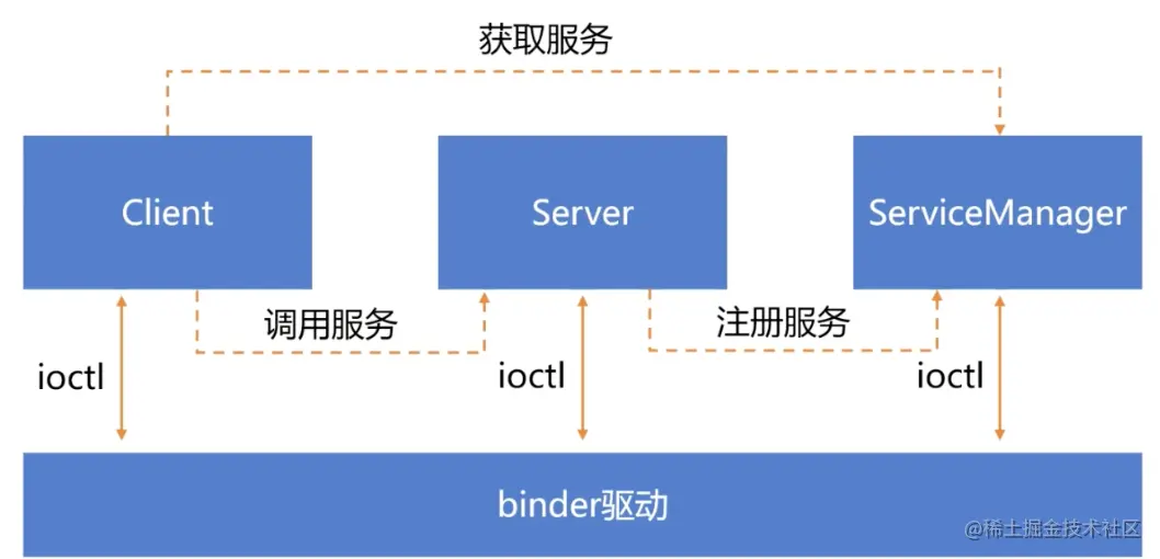 Client 端表示应用程序进程,Service 端表示系统服务,它可能运行在 SystemService 进程,比如 AMS、PKMS等,也可能是运行在一个单独的进程中,比如 SurfaceFlinger。ServiceManager 是 Binder 进程间通信方式的上下文管理者,它提供 Service 端的服务注册和 Client 端的服务获取功能。它们之间是不能直接通信的,需要借助于 Binder 驱动层进行交互。