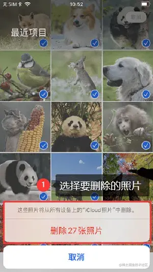 打开相册,选择需要删除的照片和视频,点击选择后,点击底部的**【删除】**按钮,即可将无用的照片和视频删除。