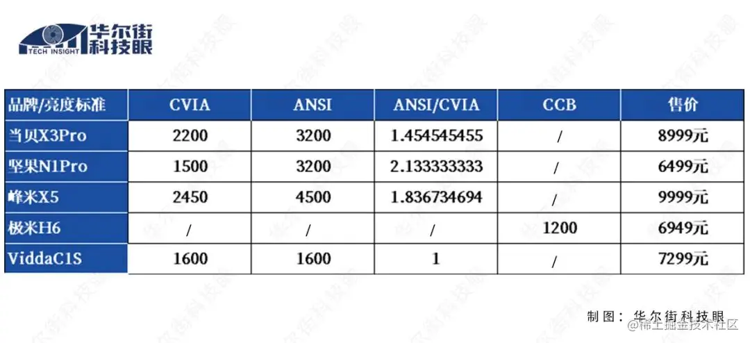 有行业人士指出,CVIA流明比起ANSI流明在测试方法上增加了诸如色温、色坐标等约束调节,但对实际测试亮度数值影响不大,即使考虑到极限情况,两者实测亮度数值一般也不会超过20%。也就是说,实测的ANSI流明和CVIA流明数值最多只会存在20%的差异。但上述品牌的参数对比,明显偏离了这一数值。
