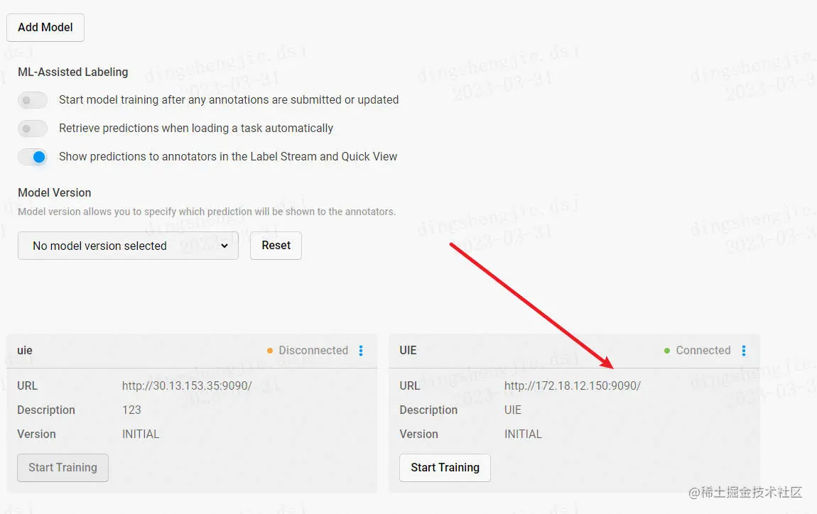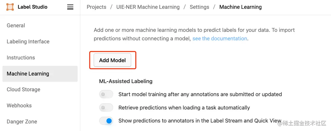 在启动自定义机器学习后端之后,就可以将其添加到 Label Studio 项目中。