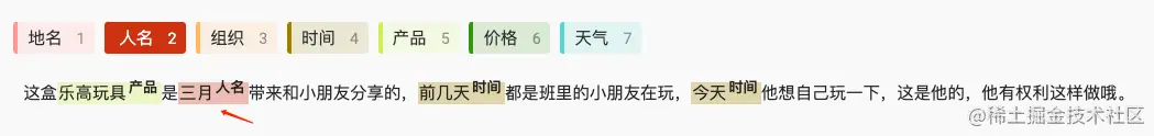 本例中,预标注的结果中将『人名』实体『三月』错标注为『时间』实体,手动进行修改。