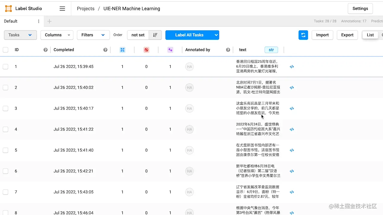 从 uie 预测结果中提取相应的字段,构成 Label Studio 接受的预注释格式。命名实体识别任务的具体预注释示例可参考 [Import span pre-annotations for text]