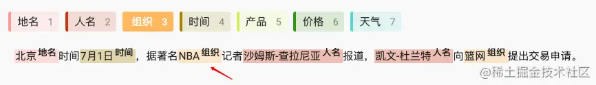 本例中,预标注的结果中『NBA』没有被识别出来,手动添加实体将其标注为『组织』。