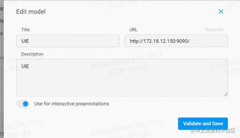 若要使用交互式预注释功能,需在添加 ML Backend 时打开 Use for interactive preannotations 选项。如未打开,可点击 Edit 进行编辑。然后随便点击一个数据,label studio 就会悄悄运行刚才的 ml backend 生成新的标注了。