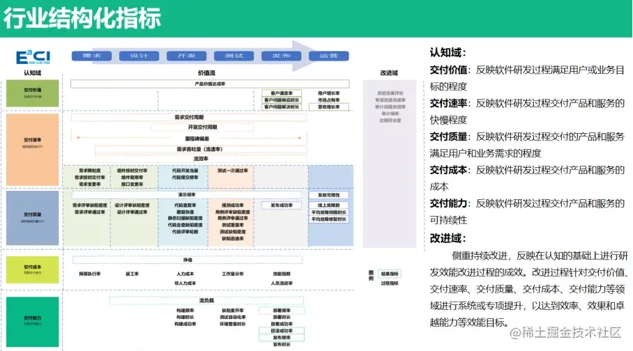 行业内有结构化的指标体系,从需求、设计、开发、测试、发布、运维等不同的阶段,对应着不同的指标。但是需要提醒一点,搭建指标体系不是越全越好,而是要根据团队所处的不同阶段,遇到的不同问题,最主要的是想要通过指标解决哪些问题,然后进行指标的设计与体系的搭建。