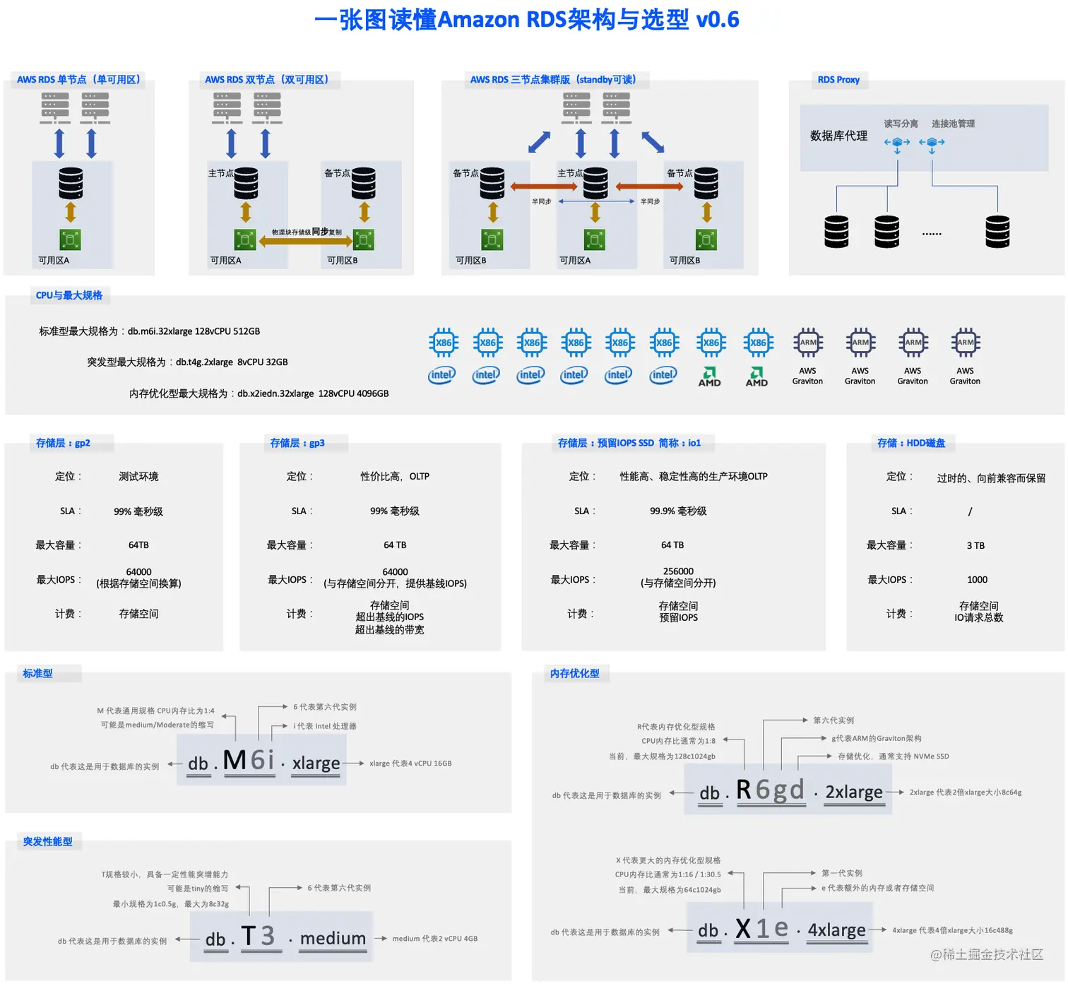 该架构图包含了高可用架构、CPU 架构选择、存储类型选择等内容。该架构图不包括性能、精确的对应关系(如 SQL Server 支持的存储空间大小与 MySQL 有什么差别)等内容,暂时不包括 Aurora 架构(后续考虑补充)、Custom、Outpost 类型等。