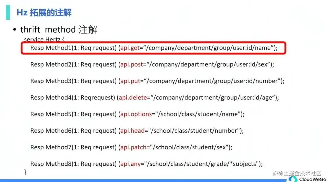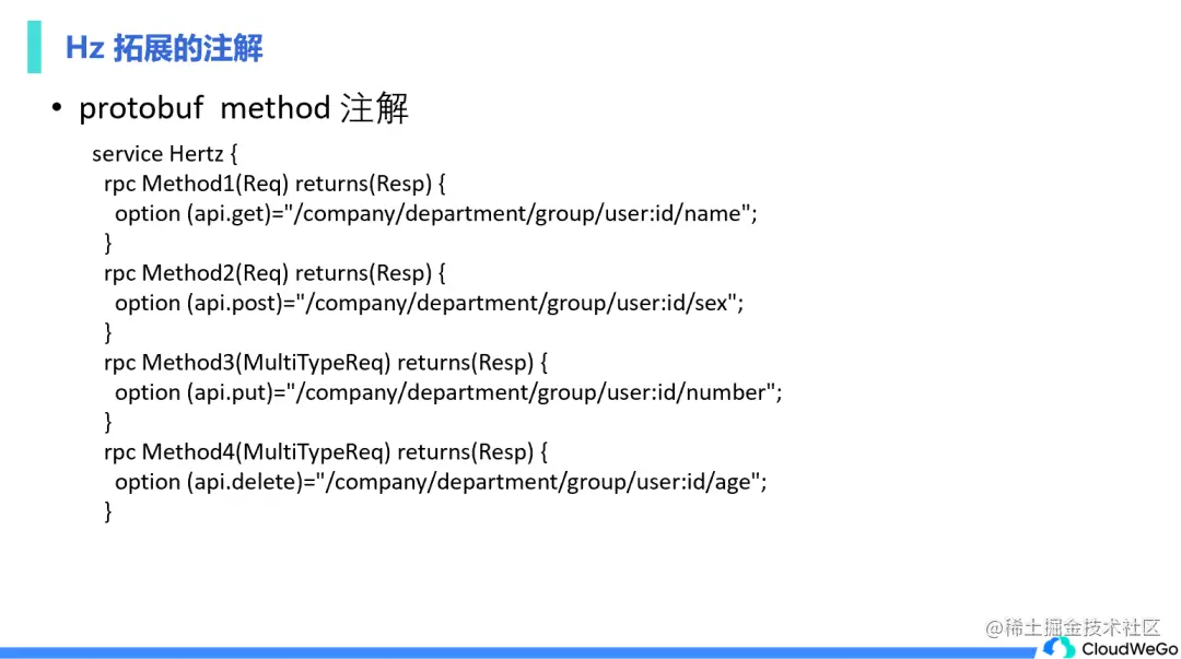 Protobuf 的 Method 注解和 Thrift 也是一致的,这里不再赘述,具体可以到 Hz 的使用手册中查询。