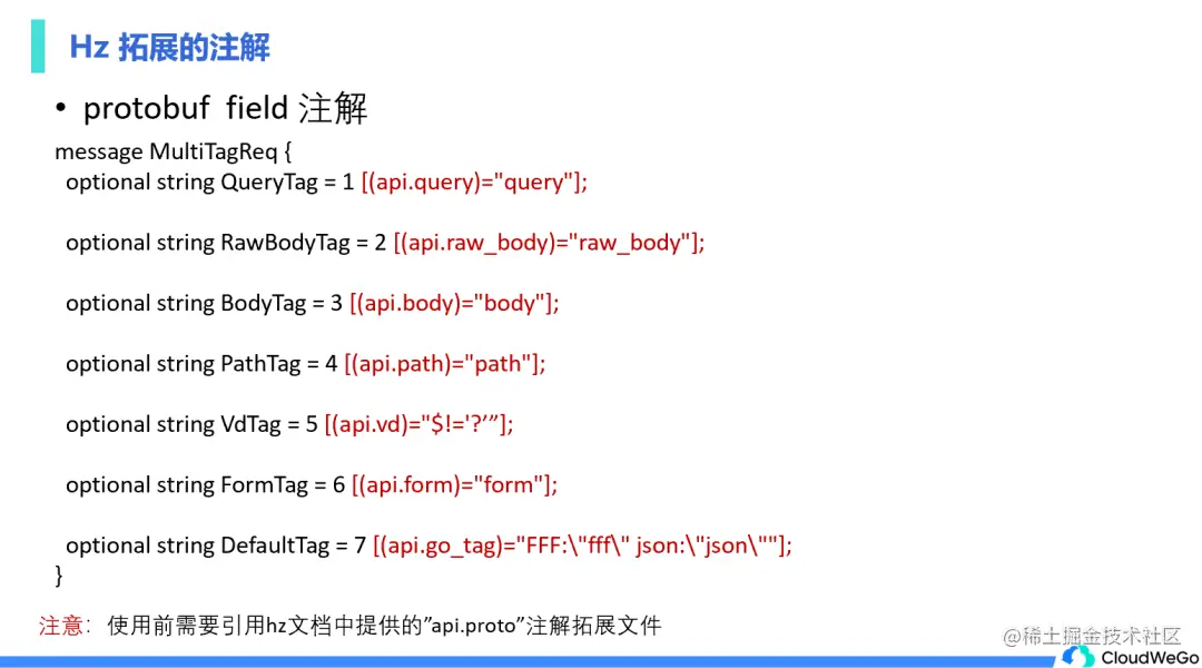 在使用 Protobuf 写 IDL 的时候,需要提前引用 Hz 文档中提供的 api.proto 注解拓展文件,才能够正确地使用注解并生成想要的代码。