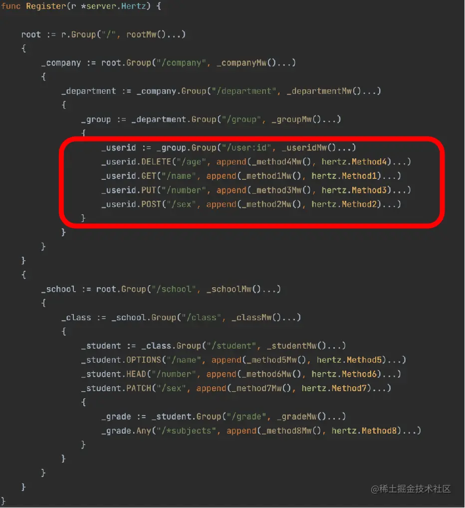 下图展示了用 IDL 给上图中定义的接口生成的代码。以红框为例,给出了一个 userid 的路由组,我们在路由组里面可以注册一些中间件函数,当用户路由与中间件函数的前缀相匹配时即可执行。之后 Hz 工具会将所有的路由进行最终的注册,例如这里注册的 DELETE、GET、PUT、POST等方法,此外 Hz 还会为其生成一个默认的 Handler 逻辑。