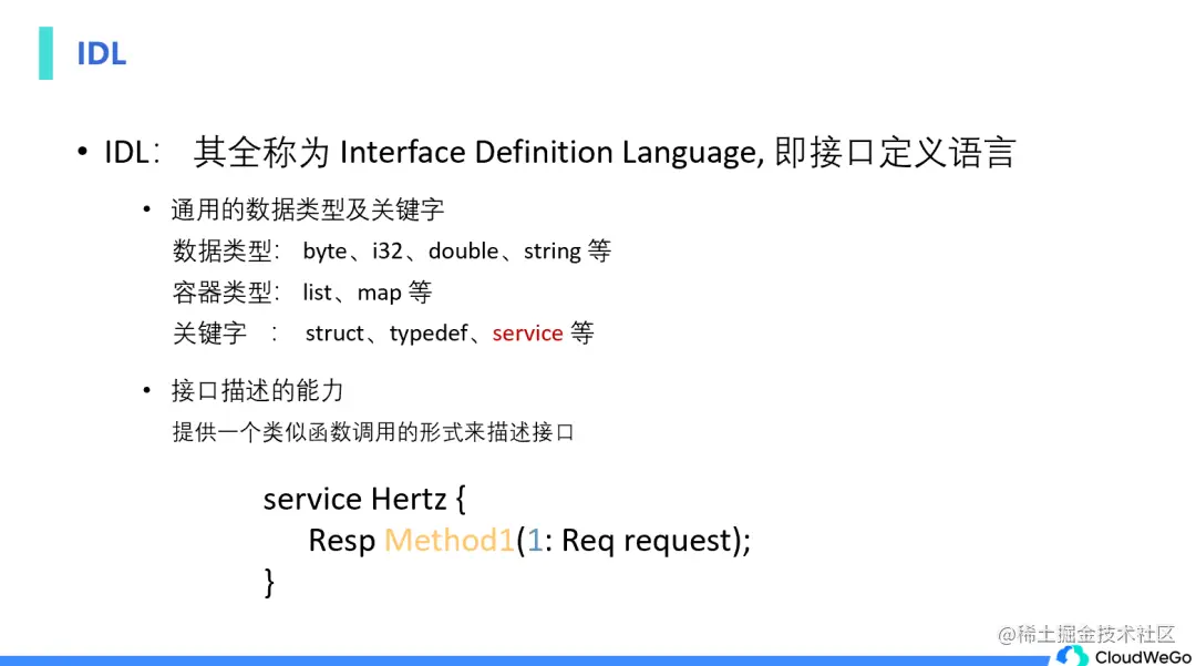 IDL 的全称是 Interface Definition language,即接口定义语言。为对接口进行通用性的描述,其一般都包含以下两个部分:1. 通用的数据类型及关键字。 IDL 与目标语言的类型存在映射关系,例如 i32 对应到 Go 语言就是 Int 类型,关键字 Struct 会对应为 Go 语言中的结构体。2. 通用的接口描述能力。 一般 IDL 会提供一个类似函数调用的形式来描述接口,并使用通用的数据类型组合给出请求参数和返回参数的类型。