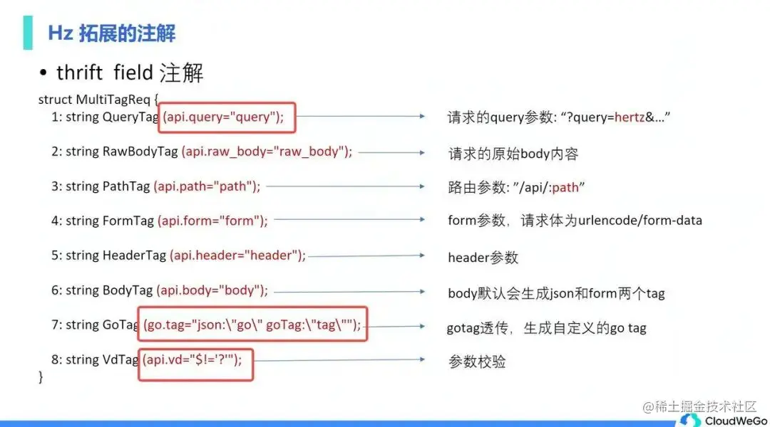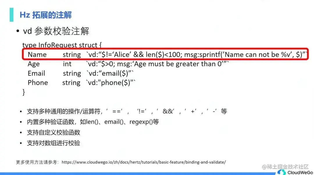 - VdTag 用来进行参数校验。目前 Hertz 的参数校验能力就是利用了 Vd 注解。