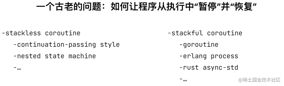 并发编程涉及到一个在计算机历史上非常古老的问题,即如何让程序从执行中“暂停”并“恢复”? 关于这个问题有两个不同的解答思路。