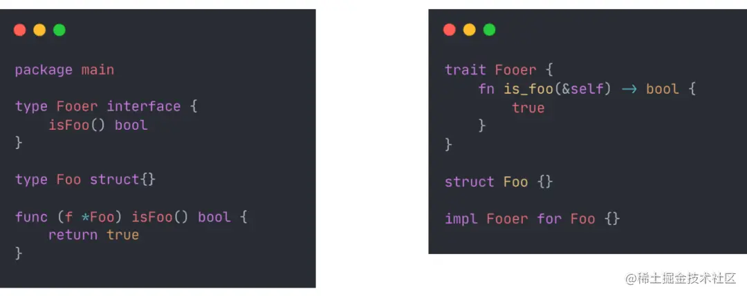 我们从生命周期的类型系统回到更加传统的类型上,Rust 与 Go 都同样使用了组合而不是继承的方式来表达类型之间的关系。这个对于 Go 开发者来讲是非常熟悉的,因为我们在 Go 中同样使用 Interface 来表达类型之间的关系。但实际上二者还是有很多不同的。