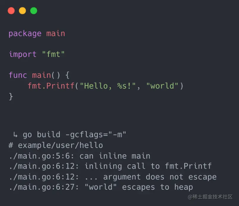 在刚刚给出的两个版本的 helloworld 实现中,其实 Go 与 Rust 的实现并不等价。因为在 Rust 中 println 是一个宏,在宏展开的过程中,它支持了编译时对打印信息的格式化。由于 Go 并不支持宏,所以我们就尝试进行改写,即基于 Go 标准库的 fmt 库做一个简单的运行时的格式化,再观察编译以及运行时的过程。下图是简单的可格式化版本的 helloworld,打开 Go 编译器的逃逸分析选项,我们会发现即使是一个简单的 print fmt 过程,也会导致 world 字符串逃逸并且被分配在堆上。